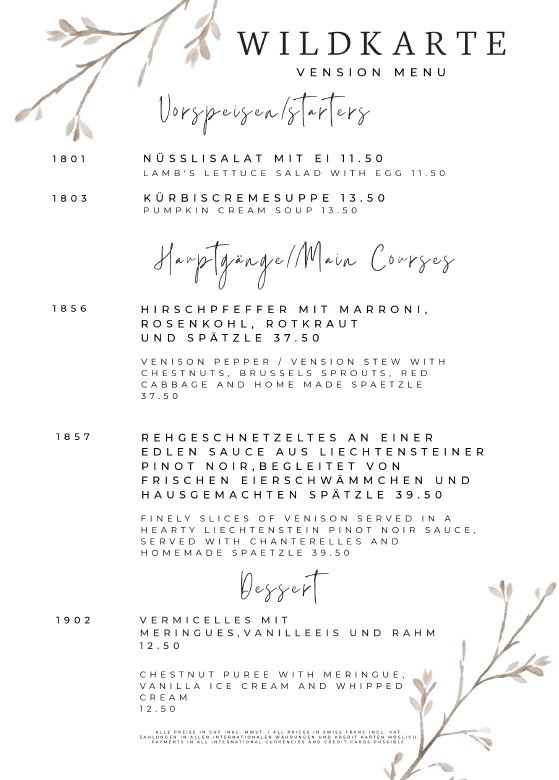 TAKE AWAY Bestellungen können nur telefonisch (+423 376 54 60) entgegen genommen werden. Wir bitten um Verständnis.